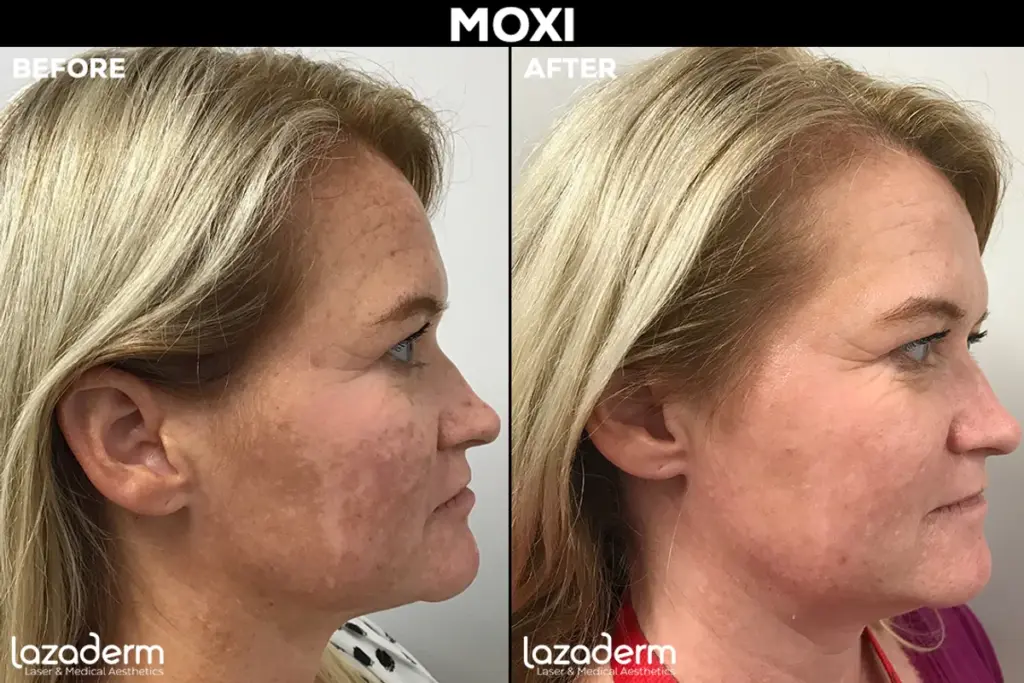 Gentle lasers like MOXI have no downtime; deeper resurfacing lasers may require a few days of healing.